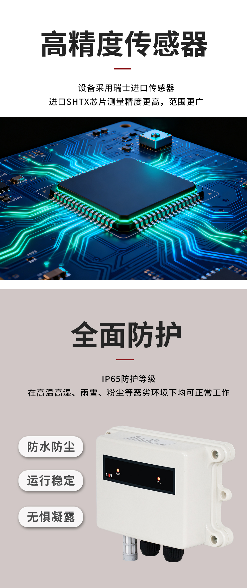 虹潤公司是專業(yè)生產(chǎn)環(huán)境監(jiān)測儀表的國家專精特新“小巨人”企業(yè)。生產(chǎn)的一體式溫濕度變送器,具有溫度、濕度、露點高精準的測量與變送,報警繼電器輸出,RS485/RS232通訊,IP65防護等級等特點。產(chǎn)品獲得一種手持式低功耗溫濕度檢測儀、大屏幕溫濕度記錄儀等2項國家發(fā)明專利,主持起草物聯(lián)網(wǎng)智能溫度儀表通用技術條件、冷鏈溫度記錄儀等2項國家標準,以及通信系統(tǒng)多通道數(shù)據(jù)采集控制終端規(guī)范軍用標準,以及現(xiàn)場設備集成等5項智能制造國家標準,參與國際5G標準制定,取得溫濕度儀表等3項相關軟件著作權。產(chǎn)品廣泛應用于工業(yè)現(xiàn)場、農(nóng)業(yè)大棚、倉儲物流、地下管廊、養(yǎng)殖孵化、配電機房等諸多領域。