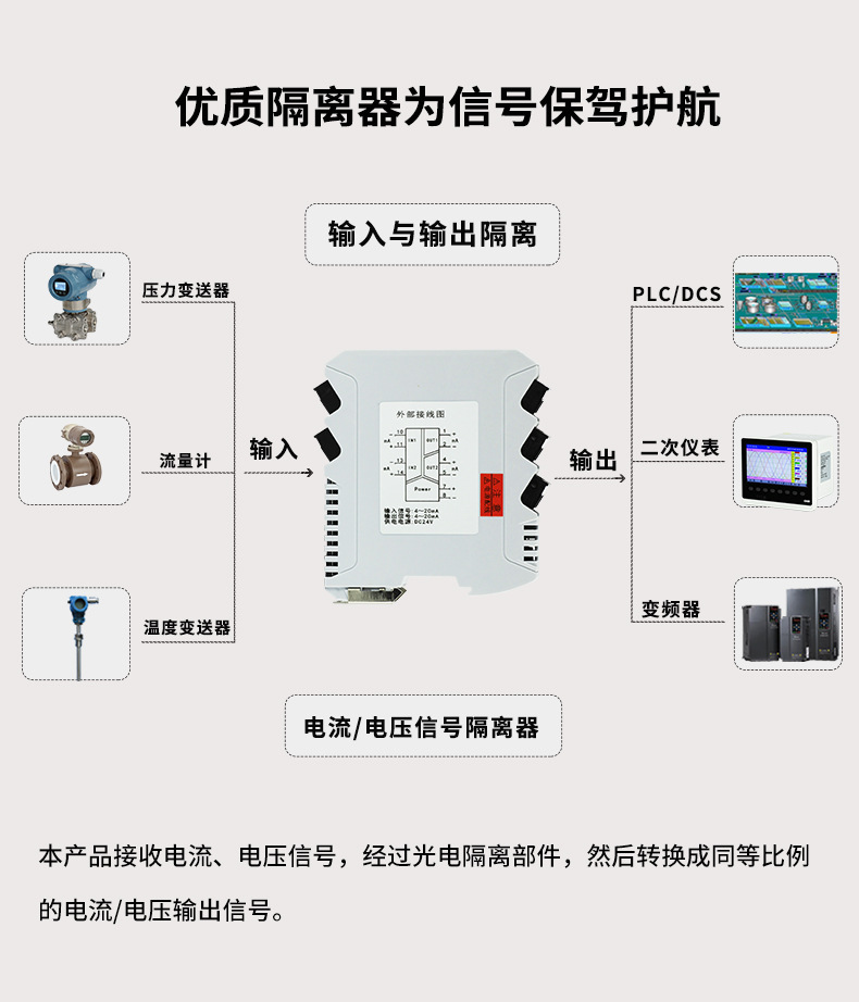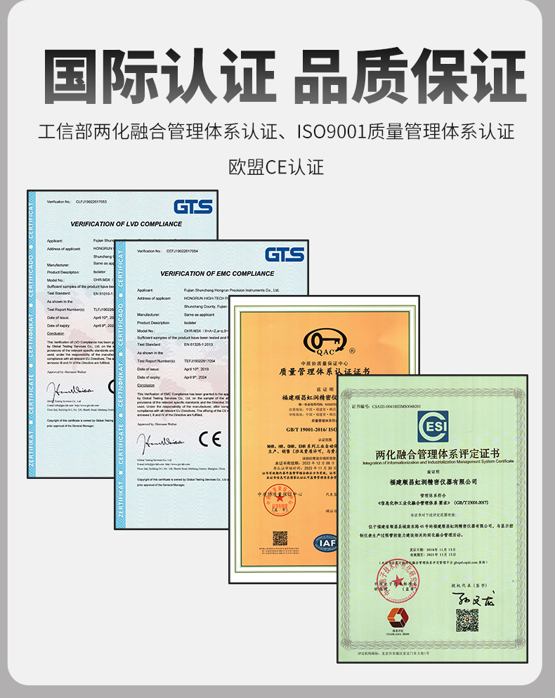 虹潤(rùn)公司是專(zhuān)業(yè)生產(chǎn)隔離器的國(guó)家專(zhuān)精特新“小巨人”企業(yè)。生產(chǎn)的智能信號(hào)隔離器涵蓋電流電壓變送器、溫度變送器、配電器、頻率轉(zhuǎn)換器、開(kāi)關(guān)量轉(zhuǎn)換器及通訊轉(zhuǎn)換器等多種產(chǎn)品類(lèi)型。產(chǎn)品獲得信號(hào)隔離器、一種二端子模塊、無(wú)源信號(hào)隔離器等3項(xiàng)國(guó)家發(fā)明專(zhuān)利,主持起草現(xiàn)場(chǎng)設(shè)備工具(FDT)接口規(guī)范、工業(yè)過(guò)程測(cè)量和控制系統(tǒng)用隔離式安全柵、工業(yè)過(guò)程測(cè)量和控制系統(tǒng)用配電器等3項(xiàng)國(guó)家標(biāo)準(zhǔn),以及通信系統(tǒng)多通道數(shù)據(jù)采集控制終端規(guī)范軍用標(biāo)準(zhǔn),參與國(guó)際5G標(biāo)準(zhǔn)制定,取得導(dǎo)軌式智能隔離器、頻率轉(zhuǎn)換器等3項(xiàng)相關(guān)軟件著作權(quán)。產(chǎn)品廣泛電力、冶金、工業(yè)電爐、變電站、高壓電機(jī)房等需要電隔離的工業(yè)自動(dòng)化控制系統(tǒng)。