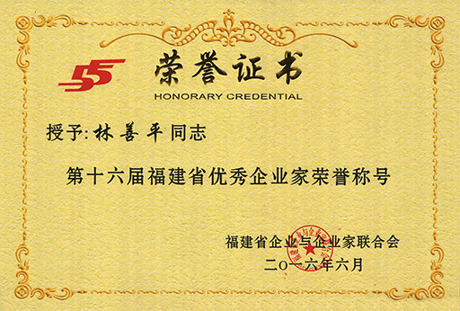 為弘揚(yáng)優(yōu)秀企業(yè)家深化改革、科學(xué)管理、與時(shí)俱進(jìn)、勇于創(chuàng)新的開拓精神,激勵(lì)廣大企業(yè)家敢為天下先、愛拼才會(huì)贏的闖勁,為推動(dòng)福建省產(chǎn)業(yè)轉(zhuǎn)型升級(jí)和經(jīng)濟(jì)持續(xù)健康發(fā)展建功立業(yè),近日,福建省企業(yè)與企業(yè)家聯(lián)合會(huì)組織開展了每兩年評(píng)選一次的福建省優(yōu)秀企業(yè)家評(píng)選工作,并于2016年6月24日決定授予98位企業(yè)經(jīng)營管理者“第十六屆福建省優(yōu)秀企業(yè)家”榮譽(yù)稱號(hào),虹潤公司董事長林善平榮獲該榮譽(yù)稱號(hào)。