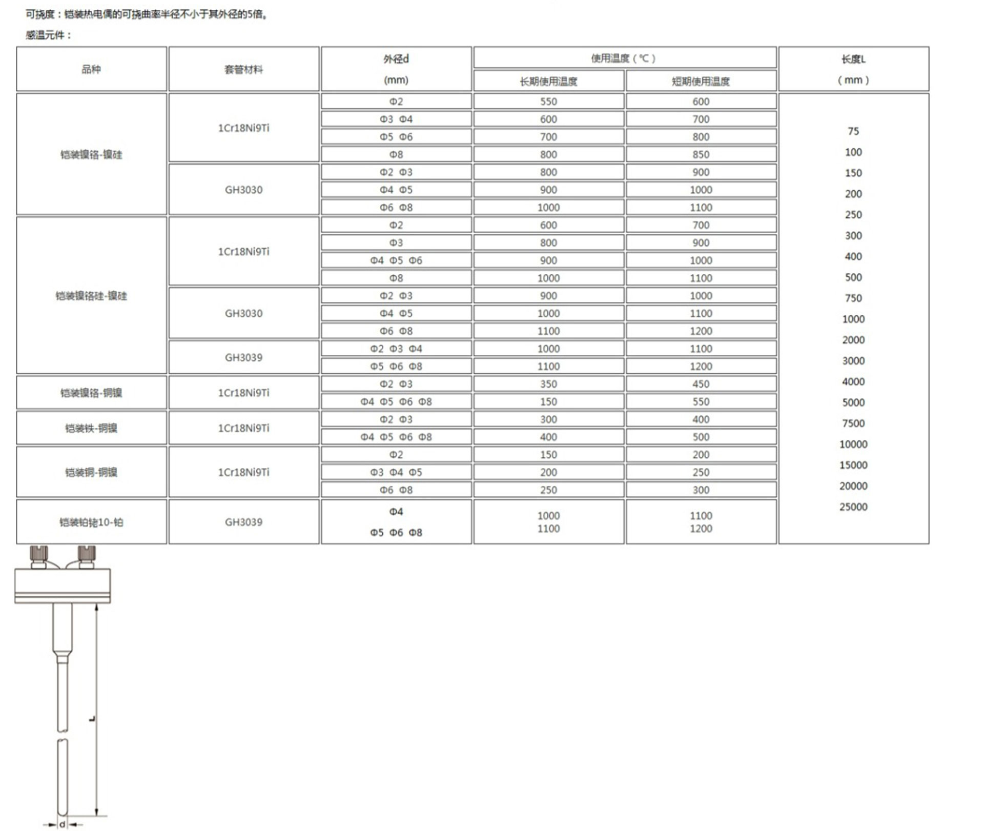 鎧裝熱電偶作為溫度測(cè)量傳感器,通常與溫度變送器、調(diào)節(jié)器及顯示儀表等配套使用,組成過程控制系統(tǒng),用以直接測(cè)量或控制各種生產(chǎn)過程中0-1800℃范圍內(nèi)的流體、蒸汽和氣體介質(zhì)以及固體表面等溫度。鎧狀熱電偶具有能彎曲、耐高壓、熱響應(yīng)時(shí)間快和堅(jiān)固耐用等許多優(yōu)點(diǎn)。