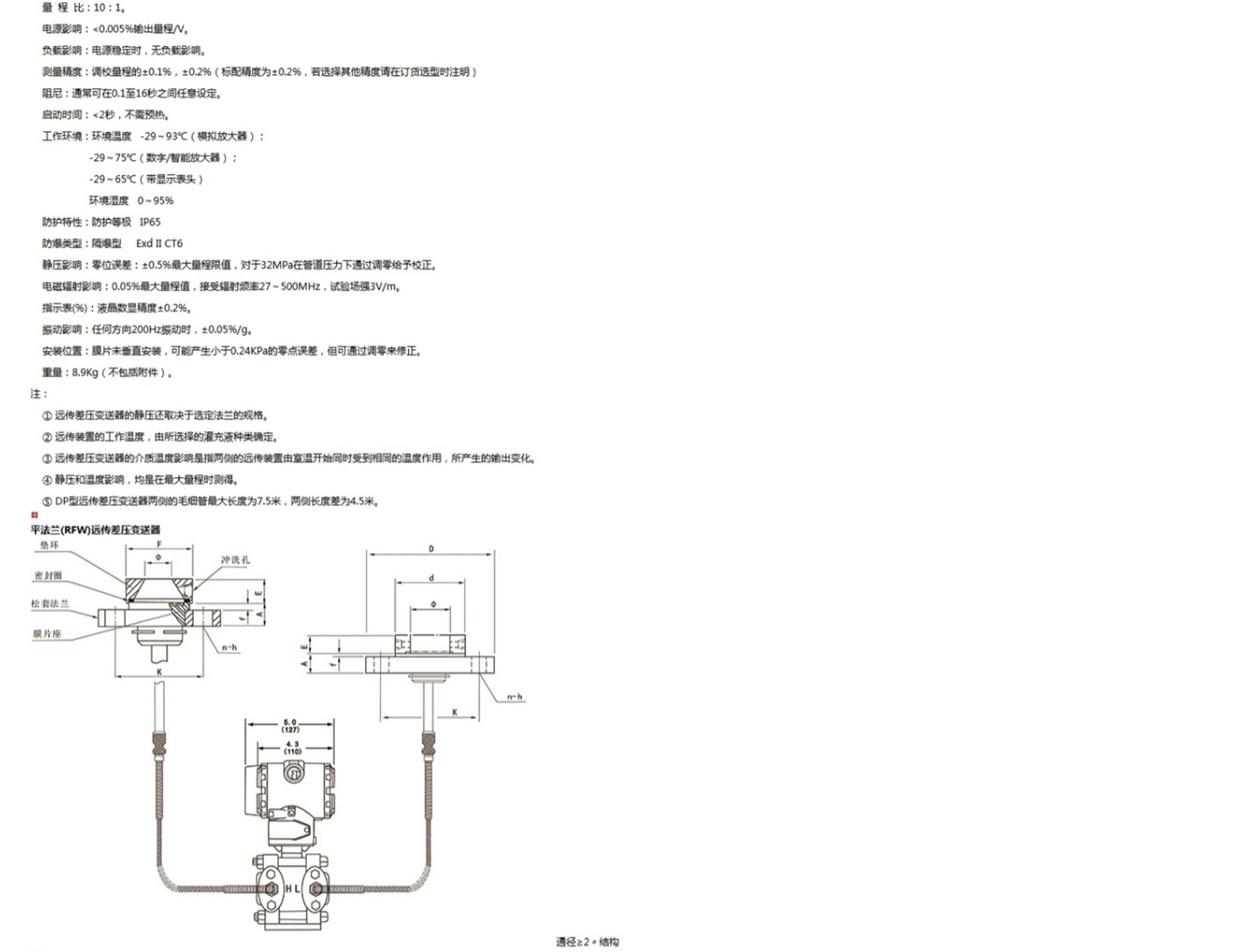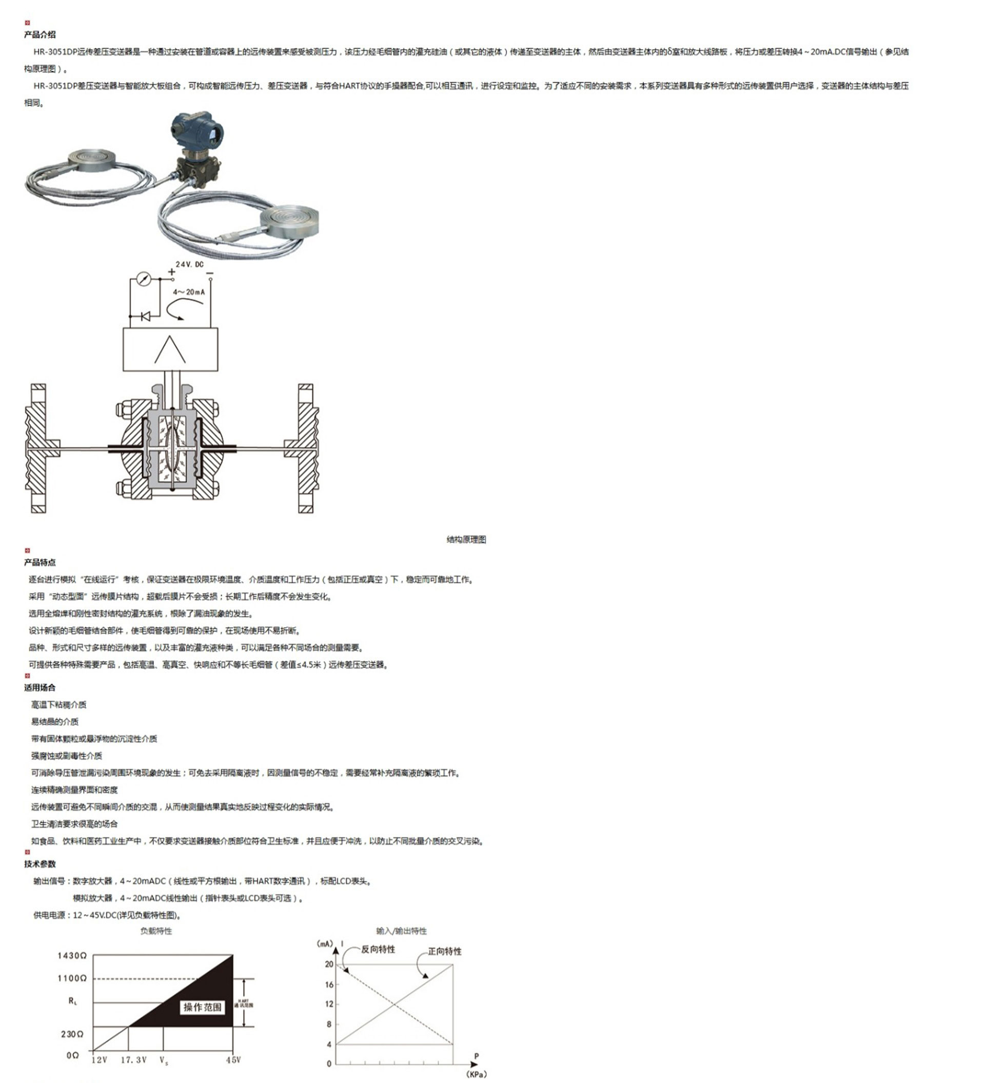 HR-3051DP遠傳差壓變送器是一種通過安裝在管道或容器上的遠傳裝置來感受被測壓力,該壓力經毛細管內的灌充硅油(或其它的液體)傳遞至變送器的主體,然后由變送器主體內的δ室和放大線路板,將壓力或差壓轉換4~20mA.DC信號輸出。