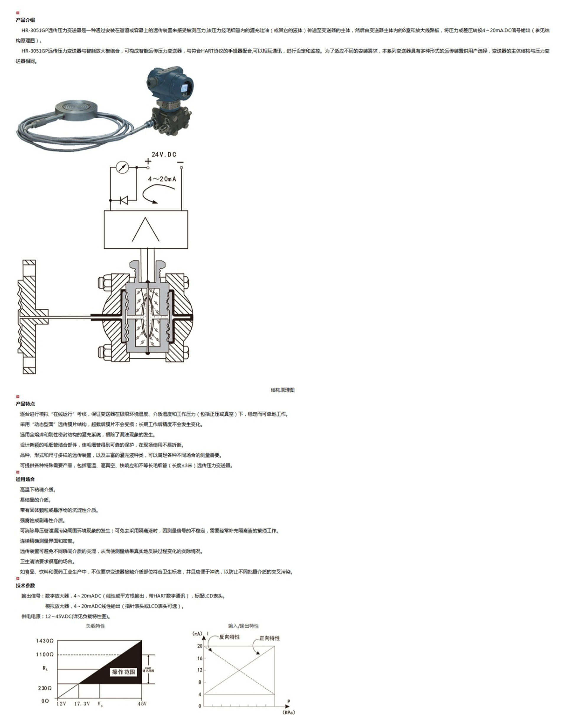 HR-3051GP遠(yuǎn)傳壓力變送器是一種通過安裝在管道或容器上的遠(yuǎn)傳裝置來感受被測(cè)壓力,該壓力經(jīng)毛細(xì)管內(nèi)的灌充硅油(或其它的液體)傳遞至變送器的主體,然后由變送器主體內(nèi)的δ室和放大線路板,將壓力或差壓轉(zhuǎn)換4~20mA.DC信號(hào)輸出。