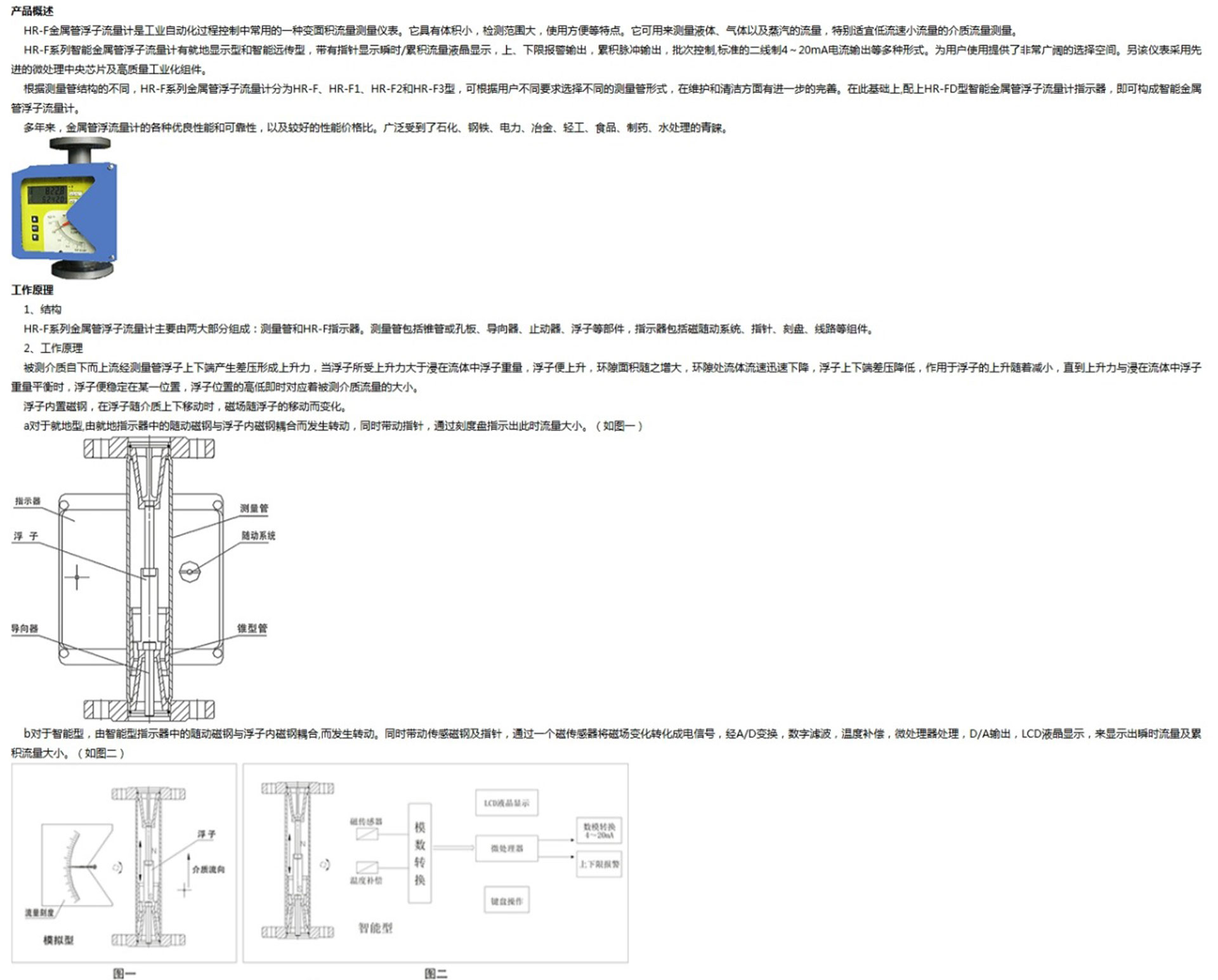 HR-F金屬管浮子流量計是工業(yè)自動化過程控制中常用的一種變面積流量測量儀表。它具有體積小,檢測范圍大,使用方便等特點(diǎn)。它可用來測量液體、氣體以及蒸汽的流量,特別適宜低流速小流量的介質(zhì)流量測量。